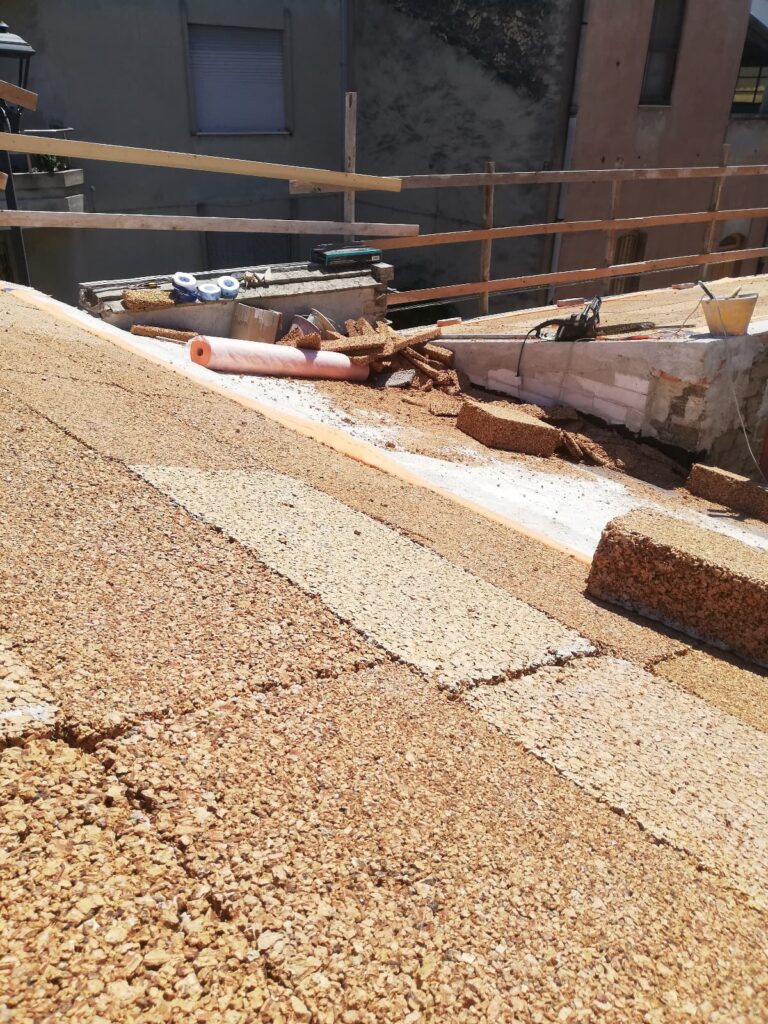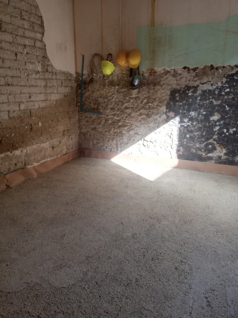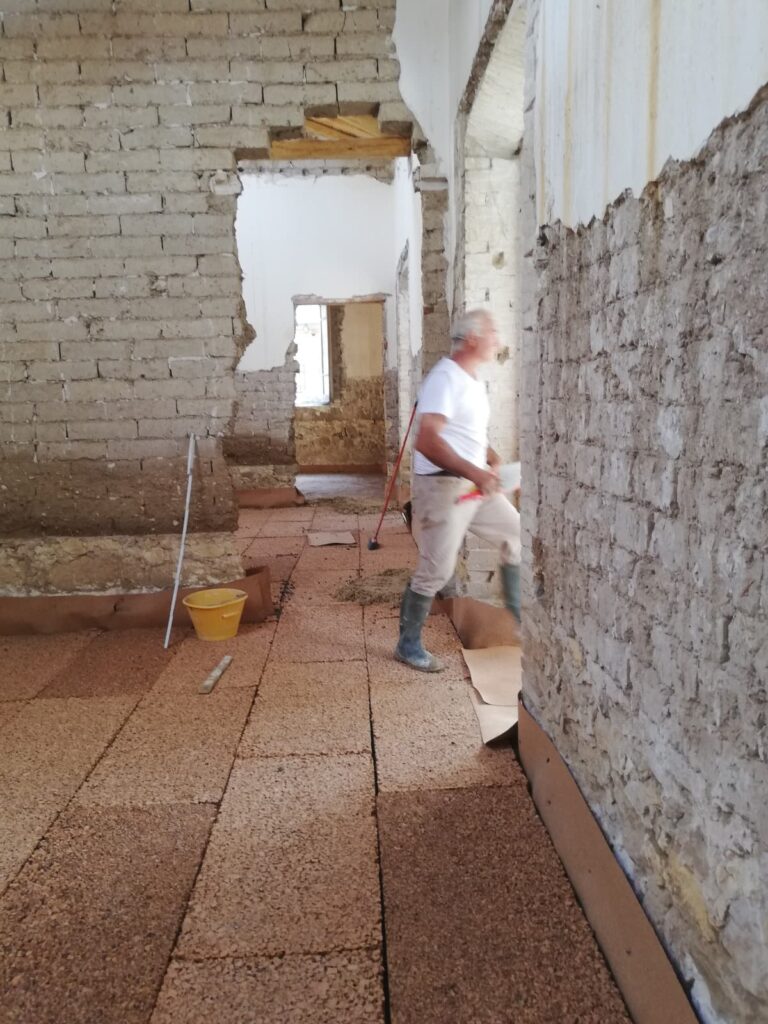 Nel sottopavimento si è realizzato un pacchetto multistrato isolante e traspirante composto da argilla, sughero, canapa e calce.