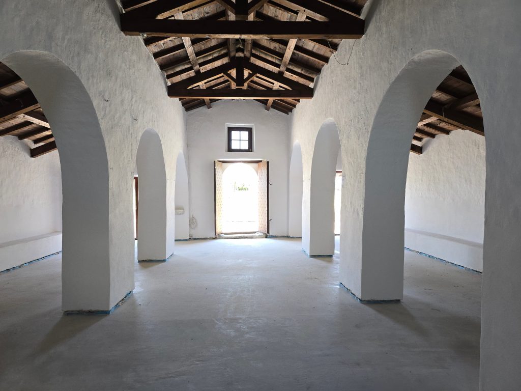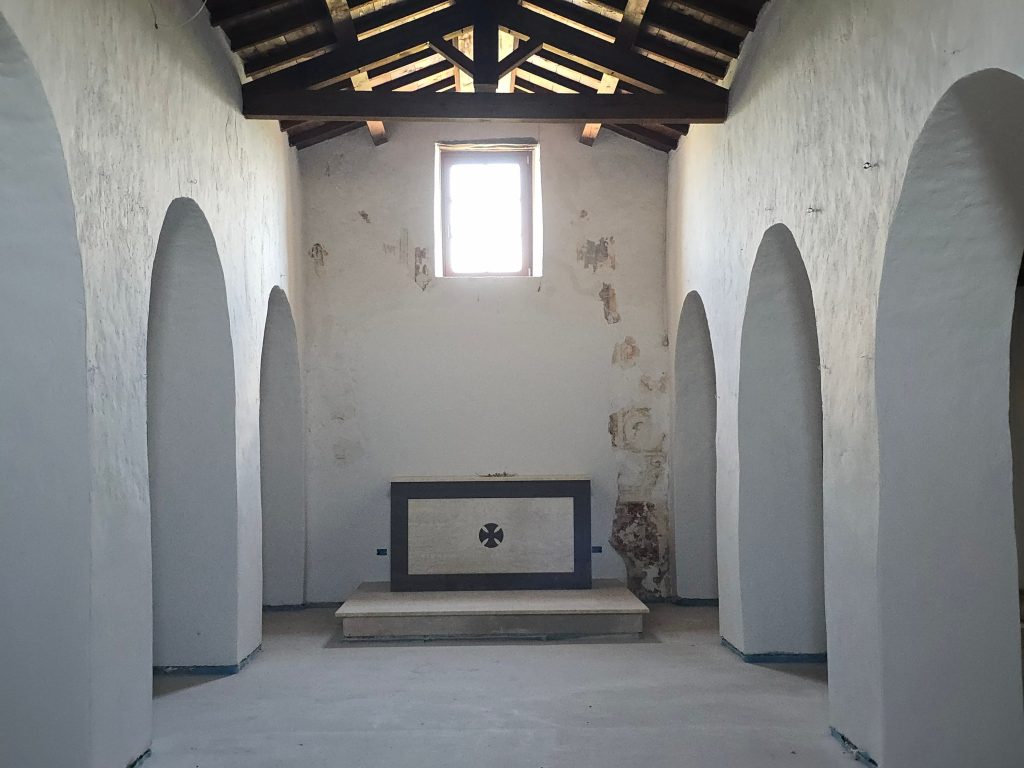 Il punto centrale del progetto ha riguardato la restituzione dell’orientamento liturgico originario: un atto di riparazione storica che ha previsto la riapertura degli antichi ingressi a Ovest e la ricostruzione del campanile a vela. Attraverso il sapiente consolidamento delle murature in pietra e la ripresa delle stilature dei conci, l’edificio è stato sottratto all’inagibilità.